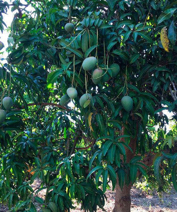 Fruto suculento, carnoso, de forma arriñonada u oval, de color verdoso, amarillento, rojizo, muy dulce y que encierra un hueso o cavozo grande, aplanado, rodeado de una cubierta leñosa; los hay esféricos y aplanados, como el mango de Manila, que es de los más apreciados; su contenido alcanza más del 20% en azúcares